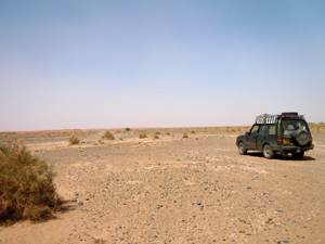 We were convinced from our research that there was a fairly strong piste to be found around the east side of the Chebbi dunes, but all our waypoints and two gps navigators failed to reveal the unmarked trail we sought. After a long drive we arrived unexpectedly at the dunes, a majestic and spectacular formation in the morning sun. This isolated sand sea rises unannounced from a flat stony desert, a great golden erg stretched into the desert haze. Whispering winds sculpt the sand into a maze of crests and curves, hollows and heights all basking in the morning sun.