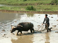 Great grey water-buffalo raise their shaggy heads and toil slowly up and down through the mud. They love water and wear a benign and peaceful expression, carrying their head back and chin up as if savouring the last of the air before they sink into the water. They pick their legs high, with surprising elegance, as they draw the plough or harrow, and at the end of each short run they turn, without waiting for an order, and slowly toil their way back again.