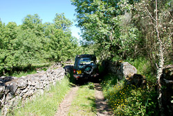 Passing drifts of wild flowers in lush meadows we came to a deepening gorge with the steep sides concealing the river far below us. At lunchtime we sighted a wonderful old bridge. I reminded Raymond that this had never been built for vehicles, and when we arrived we had to swing back both wing mirrors to squeeze through the entrance.