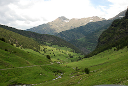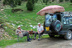 We arrived at Fos on the border of Spain and set off up a verdant valley. At the end of a slow 20 mile drive up a track, increasing snow damage told of springtime avalanches. Finally a great 50 yard snowdrift lay in our way. It had slithered down the mountain, sweeping many trees in its wake and was clearly impenetrable. We were forced to make a multi point turnaround on the mountainside and retrace our steps.
